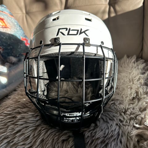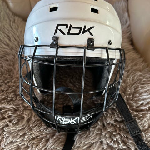RBK 1K ishockeyhjelm / bandyhjelm med gitter. Hjelmen er hvit med svart gitter og er sertifisert etter EN 10256. Størrelse 50–57 cm. Justerbare stropper og festeanordninger for tilpasning til hodet. Egnet til bruk til ishockey og bandy som krever god hode- og ansiktsbeskyttelse. Se også mine andre annonser med bandyutstyr til barn.