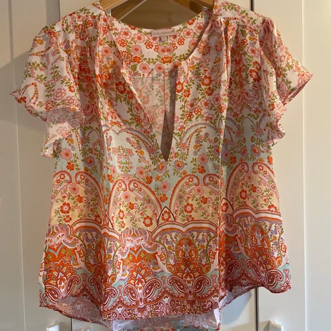 Bluse for dame i størrelse XL. Blusen har kort erm, V-utringning og knappestolpe foran. Stoffet har et flerfarget, orientalsk-inspirert mønster med hovedfarge i varme røde og oransje toner. Passer til hverdagsbruk eller som en lett topp til sommeren.
