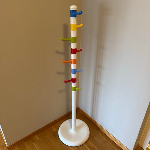IKEA stumtjener for barn i flerfarget utførelse. Stumtjeneren har flere kroker i ulike høyder som passer for barneklær, jakker, sekker og tilbehør. Stabil fot sørger for at den står stødig på gulvet. Egnet til bruk på barnerom, i gang eller lekerom.