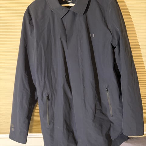 Jakken er blå og laget i viskosemateriale. Den har hette, frontglidelås og glidelåslommer i siden.