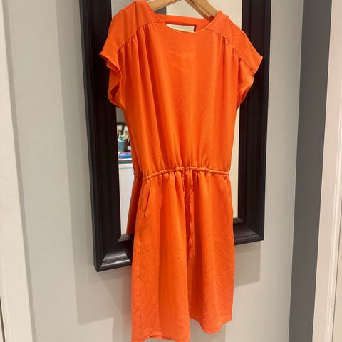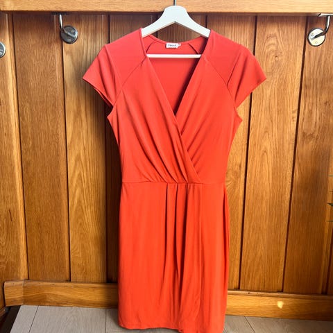 Lindex hverdagskjole for dame i størrelse M. Kjolen er oransje og laget i viskose. Modellen har kort erm, V-utringning og knytebelte i livet. Lengden går omtrent til kneet, avhengig av høyde. Passer som enkel hverdagskjole eller til uformelle anledninger.
