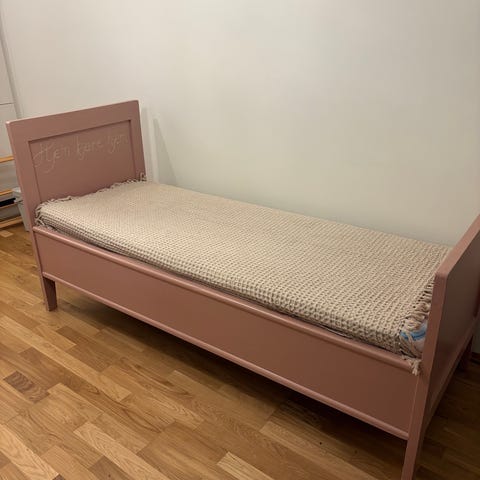 Plassbygd av Arne Ivar Bakk, beste håndlaget kvalitet. Er demontert og var en del av større seng. Er for fin til å kastes eller brennes, så håper noen vil ha den. Krever litt småarbeid for å sette sammen. Gis bort snarest, står i garasje i Hornlia.