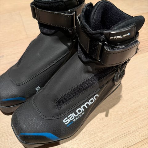 Salomon Prolink langrennsstøvler i svart farge. Støvlene har høy ankelstøtte med hælstropp og borrelåslukking øverst for bedre stabilitet. Overdelen har glidelås og beskyttende gamasje som dekker lissesystemet. Sålen er Prolink-type med mønster tilpasset Prolink-bindinger. Egnet til klassisk langrenn. Yttermateriale i syntetisk materiale med polstret innside for økt komfort. Str 39. Bruksmerker, slitasje
