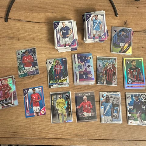 Sett med offisielle topps Premier League samlekort 2026. Kortene viser ulike spillere fra flere klubber i Premier League, inkludert standardkort og spesialkort med ulike design.