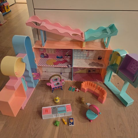 Seng, to stoler, bord, toalett, to lamper, plante, gyngestol, stekeovn og sofa. Selges på feil størrelse.