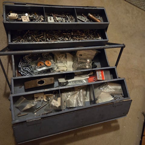 Metall verktøykasse i grønn farge. Kassen har flere uttrekkbare rom/etasjer som gir god oversikt og inndeling til verktøy og smådeler. Det er bærehåndtak på toppen for enkel transport. Egner seg til oppbevaring og organisering av håndverktøy, skruer, spiker og annet tilbehør i garasje, verksted eller hobbyrom.