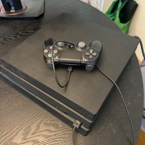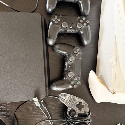 PlayStation 4 Pro spillkonsoll i svart. Konsollen er en stasjonær hjemmekonsoll i PlayStation 4-serien, egnet for tilkobling til TV eller skjerm via HDMI. Du får 5 stk spiller med på kjøpet.