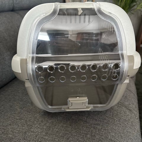 Transportbur til kjæledyr i hard plast med gjennomsiktig frontluke.