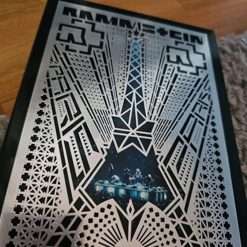 Rammstein sett med DVD og CD. Inneholder to utgivelser i separate omslag, slik som vist på bildet. Egnet for samlere eller for de som ønsker fysisk utgave av musikken og tilhørende videoinnhold fra bandet. Detaljer om nøyaktige titler og innhold fremgår av coverne på bildene.