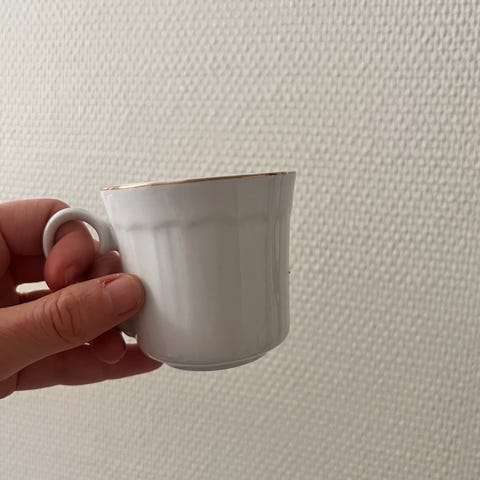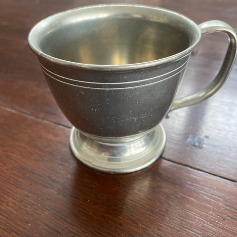 Dekorert messingkopp med hank fra Midtøsten. Kjøpt i Qatar på 1970-tallet. Har kun vært brukt som pyntegjenstand