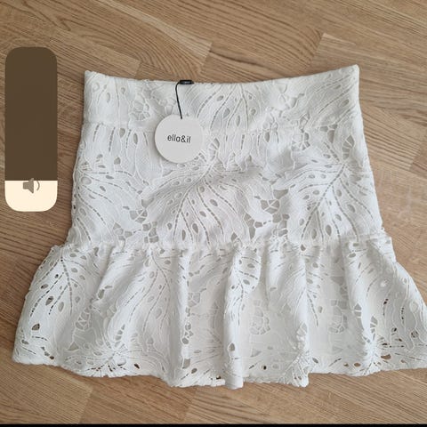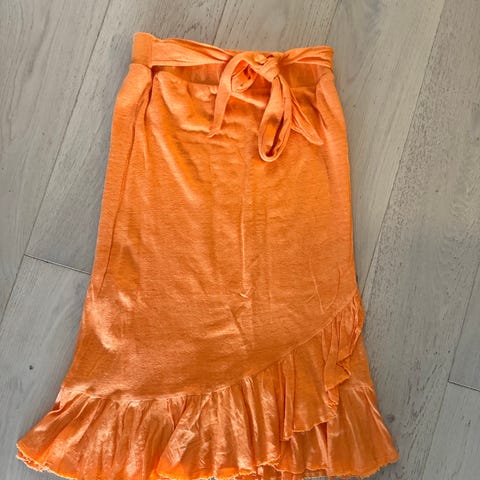 ella&il skjørt i brun fløyel str L. Skjørtet har omslagseffekt med knyting i siden og volangkant nederst. Pent brukt.
