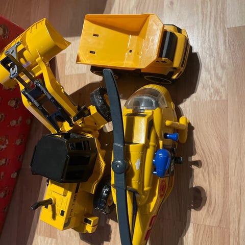 Flere leker / kjøretøy, blant annet gravemaskin, politimotorsykkel og brannbil, og bilnøkler i plast.