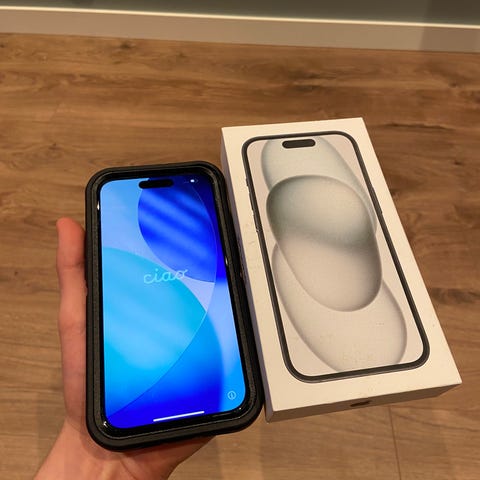 Apple iPhone 15 mobiltelefon med 128 GB lagringsplass.