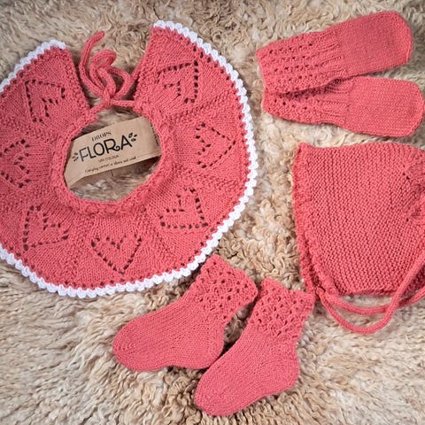 Helt nytt strikket baby sett. De er strikket i miniraggi 75% ull superwash, 25% polyamid og de gråe garnet er Rauma finull, 100% ull. Se siste bilde på mål på sokkene