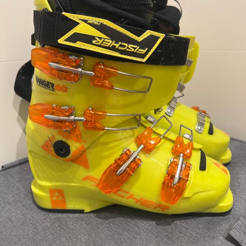 Fischer skistøvler i størrelse 26,5. Modellen er i svart med gule detaljer og har fire spenner foran samt powerstrap øverst for bedre tilpasning rundt leggen. Sålen er merket med størrelsen 26,5. Støvlene har justerbare metallspenner for å kunne tilpasses fot og vrist. Egner seg til bruk i alpinanlegg med standard alpinbindinger.