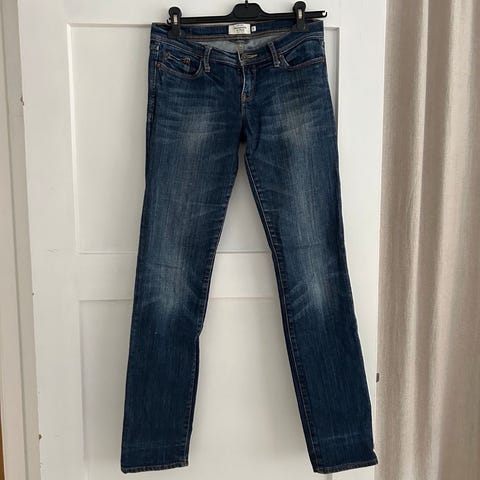 Abercrombie & Fitch jeans for dame i størrelse M med livvidde W28. Buksen er laget i blå denim. Klassisk femlommersmodell med glidelås og knapp i front, samt beltehemper i linningen. Baklommene har dekorative sømmer og skinnlapp med Abercrombie & Fitch-logo på linningen bak. Egnet til hverdagsbruk og kan kombineres med ulike topper og sko.