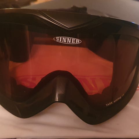Sinner skibriller i svart med oransje linse.
