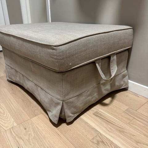 Puff med oppbevaring trukket i rutete tekstil i nøytrale beige toner. Puffen har lokk som kan åpnes og gir et praktisk oppbevaringsrom innvendig, egnet for for eksempel puter, pledd eller mindre gjenstander. Mykt polstret topp gjør at puffen kan brukes både som ekstra sitteplass og som fotskammel i stue eller oppholdsrom.