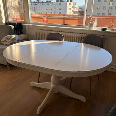 Selger et hvitt rundt spisebord kjøpt hos JYSK. Bordet er pent brukt og i god stand.