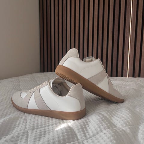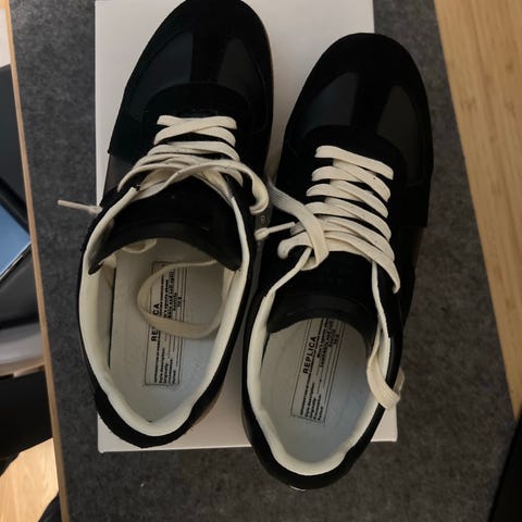 Maison Margiela sneakers i størrelse 44. Modellen har overdel i ulike blåtoner med kombinasjon av glatt materiale og semskede partier, lyse lisser og lys gummisåle med mønster for grep. Klassisk lav modell som passer til hverdagsbruk og fritid. Farge: blå med lyse detaljer. Størrelse: 44 (EU).
