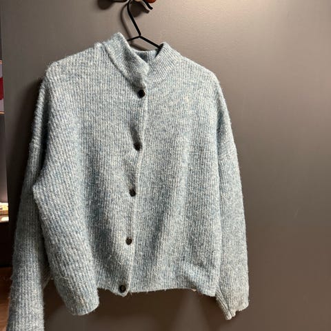 Cardigan for dame i størrelse L. Jakken er grå blå og laget i viskose. Den har knapper i front og på armene, og to lommer foran.
