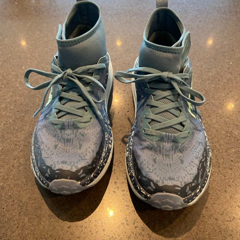 Hoka One One Speedgoat Mid 2 GTX tursko i størrelse 44. Modellen er en mellomhøy tursko til fottur, med overdel i tekstil og syntetisk materiale. Skoene har Gore-Tex-membran for vanntetthet og pusteevne. Yttersålen er utstyrt med Vibram-gummi for godt grep på variert underlag. Fargekombinasjon blå og gul med matchende lisser. Egnet til fotturer og annen bruk der det er behov for stabile og vannbeskyttende sko.