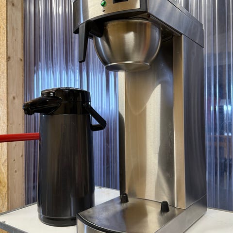 Maskinen leveres med to rustfrie kaffebeholdere med tappekran. Lager ca. 5 liter kaffe per brygg (ca. 40 kopper per omgang)