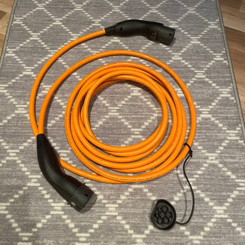 Tesla ladekabel type 2 for lading av elbil. Kabelen har type 2-kontakt i begge ender, egnet for bruk mot ladestasjoner og biler med type 2-inntak. Oransje kabel med svarte kontakter. Passer til Tesla-modeller og andre kjøretøy som benytter type 2-standard for AC-lading. Lengde ca7 meter og ladeeffekt til 32amp