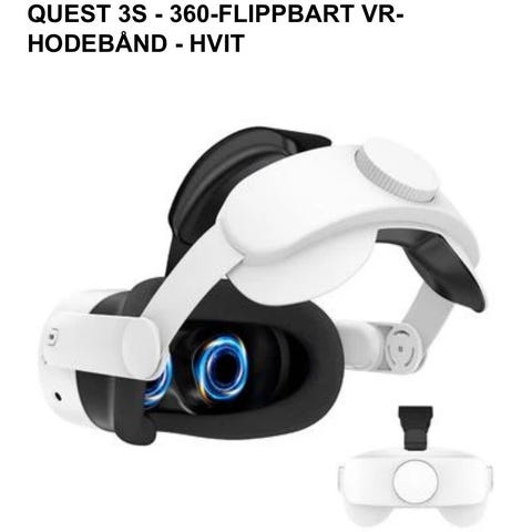 Meta Quest 3s VR-briller i hvit farge. Headsettet har integrerte sensorer i fronten for romsporing og et justerbart hodebånd i tekstil. Myk ansiktspute gir støtte rundt øyne og nese. Enheten har USB-C-port for lading og tilkobling, samt knapp for på/av på siden. Egnet til VR-spill og andre virtuelle opplevelser. Kontroller følger med.