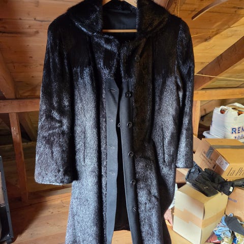 En klassisk og elegant halvlang mink pelsjakke. Jakken har rett passform og går ned over hoftene. Tett, myk og blank pels med glatt fôr på innsiden. Den har krage og lukkes med knapp øverst mot kragen, 3 klipshemper nedover under knappen. Ingen synlige skader, lukt eller slitasje. Selges for kr 2900,- eller til høystbydende.