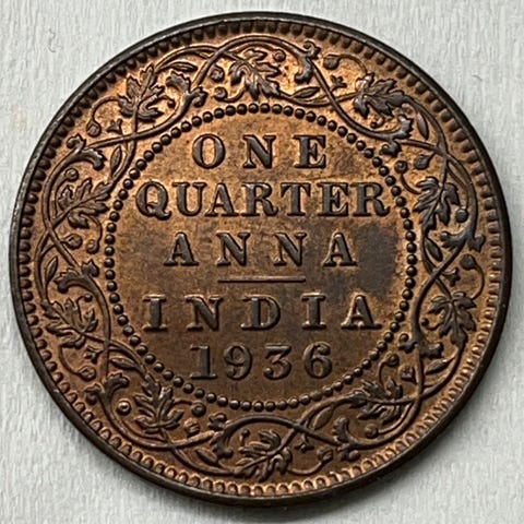 India 1/2 anna mynt fra 1936. Forsiden har teksten «1/2 Anna India 1936» omgitt av dekorativ ranke. Baksiden viser portrett av George V med teksten «George V King Emperor». Mynten er egnet for samlere av indiske mynter og historiske kolonimynter.
