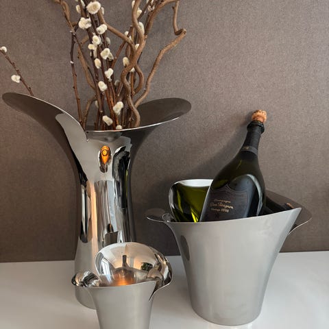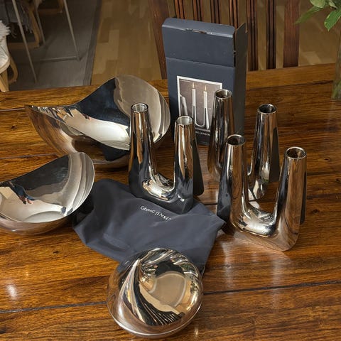 Georg Jensen skåler i riflet design, sett med to skåler i metall/stål med blank overflate. Skålene har rund form med bølget kant og riflet struktur som går fra bunn til kant. Egnet som serveringsskåler til frukt, snacks eller til bruk som dekorative boller på bord eller benk. Passer i de fleste interiørstiler og kan brukes både til hverdags og ved spesielle anledninger.