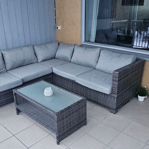 Hagemøbler og hagebord i grå utførelse. Bordet har rettlinjet design med hylle under bordplaten for ekstra oppbevaringsplass. Passer til bruk på terrasse, balkong eller i hage sammen med utemøbler. Materialet fremstår som kunstrotting eller lignende vedlikeholdsvennlig materiale til utendørs bruk.