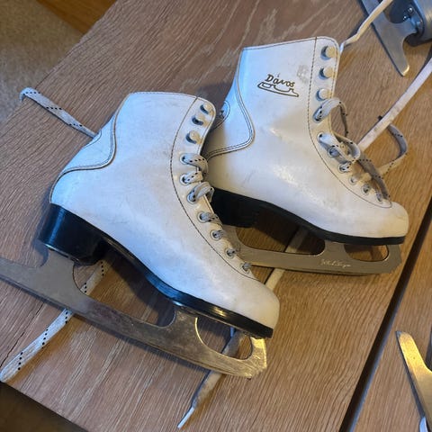 Davos kunstskøyter i størrelse 40. Klassisk hvit skøytemodell med snøring og høy ankelstøtte. Egnet til bruk på isbaner og generelt fritidsbruk på is. Skøytene har tradisjonelle stålskinner og overdel i syntetisk materiale med glatt overflate.