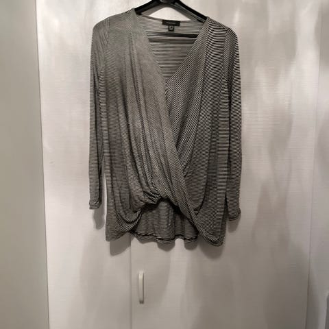 Lindex topp for dame i størrelse L. Toppen er i sølvfarget polyester med lange ermer og omslagseffekt foran. Stoffet har en lett glitrende overflate og vertikale strukturlinjer. Passer til bruk alene eller sammen med bukse eller skjørt til ulike anledninger. Tror jeg så en løs tråd, som lett kan fikses. Men fant den ikke igjen. . Svarer sms el her, til den er solgt
