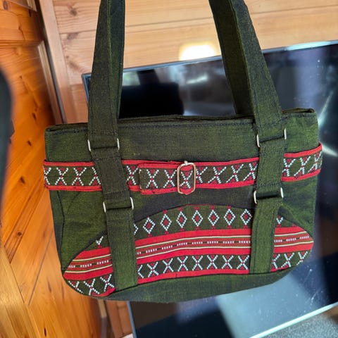 Håndsydd veske av Vintage broderi og jeans. God plass og innvendig lomme. Sendes m fiks ferdig eller hentes Hønefoss
