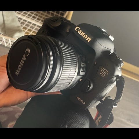 Canon speilreflekskamera med utskiftbart objektiv i svart farge. Kameraet leveres med et zoomobjektiv med solblender, samt en bæreveske for oppbevaring og transport. Passer til generell fotografering som reiser, portretter og hverdagsbruk. Flere manuelle innstillinger og kontrollknapper på kamerahuset gir mulighet for justering av eksponering og fokus etter behov.