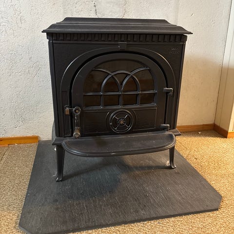 Selger en solid og klassisk Jøtul vedovn i støpejern, trolig modell fra Jøtul 8-serien.