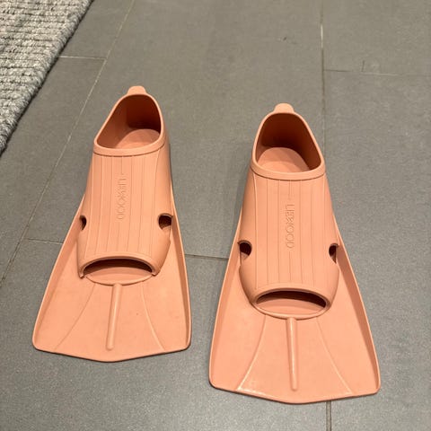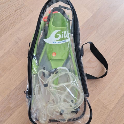 Dykkermaske, snorkel og svømmeføtter til barn, ca str 5-10 år, skostørrelse 31–34. Har samme sett i gul/grønn i mindre skostørrelse.