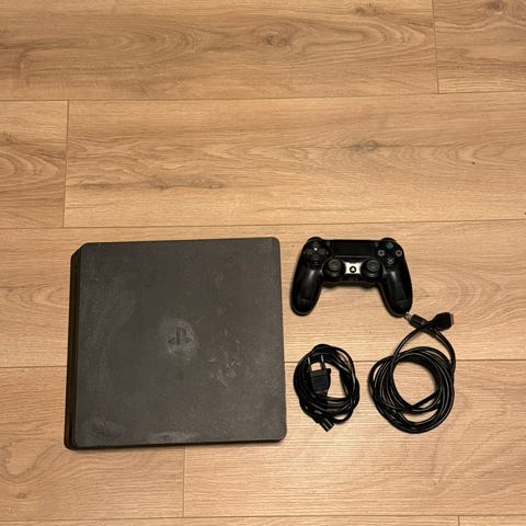 Sony Playstation 4 spillkonsoll med tilhørende kamuflasjemønstret trådløs kontroller. Medfølgende kabler inkluderer strømledning, HDMI-kabel og USB-kabel for lading og tilkobling av kontroller. Konsollen er egnet for bruk med TV eller skjerm som har HDMI-inngang. Et par spill kan selges med (stort sett eldre FIFA spill). Ta kontakt om du lurer på noe!