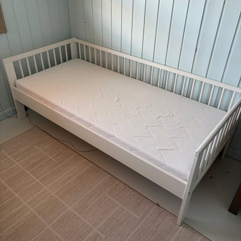 IKEA barnesenger selges (2stk) Sengene har sprosler langs tre sider som fungerer som sengehest. Passer til barn i overgang fra sprinkelseng til vanlig seng. Madrasser kan følge med. Pent/lite brukt, men noen merker på kantene. 400 pr seng, 600 for begge.