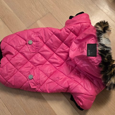 Selger en jakke til liten/mellomstor hund. 34cm. Har en avtagbar hette, og kan åpnes/lukkes med glidelås under. Er en misfarget stripe ved glidelåsen, se bilde.