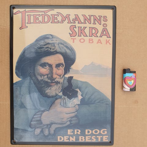 Rydder videre og Selger et EMALJESKILT PETTERØE TOBAKK... Dette er et to sidig skilt som opprinnelig var et uthengs skilt men her er det vinkla veggfestet fjernet . Skiltet ble levert av E. FEGTH BJØRGE som ikke var en produsent men leverandør av Emaljeskilt, Gradestokker og er produsert mellom 1925 og 1930. Høyde er 46 Cm og Bredde er 45 Cm. Vekt er hele 2047 Gr. Skiltet er flatt og produsert med Sjablong og litt Silketrykk Teknikk . Henger fint på veggen med 2 eller 4 skuer i mot kantene men en Handy Man lager lett et nytt vegg feste.. Er et nydelig blankt og fint Emaljeskilt uten større skader så noe glans og skygge på bilder her da.