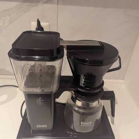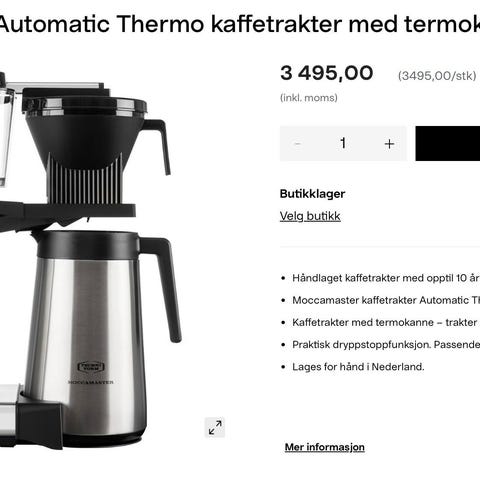 Moccamaster kaffetrakter med to termokanner. Trakteren har dobbel bryggeenhet med separate filterholdere og vannbeholdere, og er egnet for brygging av kaffe direkte i termokanner. Termokannene er i rustfritt stål med lokk. Pent brukt, fungerer meget bra. Renses før salg