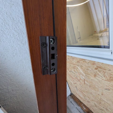 Dør 210x100cm i teak med to vinduer 210x30cm, totalt 210x160cm