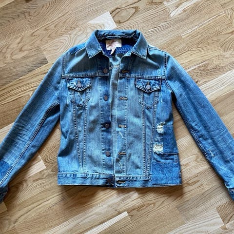 Levi's olajakke for dame i størrelse M. Jakken er laget i blå denim og har klassisk jeansjakke-design med krage, knappelukking foran og brystlommer med klaff og knapp. Ermene avsluttes med mansjetter med knapp, og det er justerbare stropper med knapper nederst bak for tilpasning av vidde. Passer til hverdagsbruk og kan kombineres med ulike plagg gjennom sesongene.