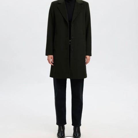 Veldig fin kåpe fra Selected Femme i str 40. Lukkes med 2 skjulte trykk knapper og knytebelte. To ytterlommer og en innerlomme, alle lommene kan lukkes med knapp. I god stand, men blir bare hengende her.