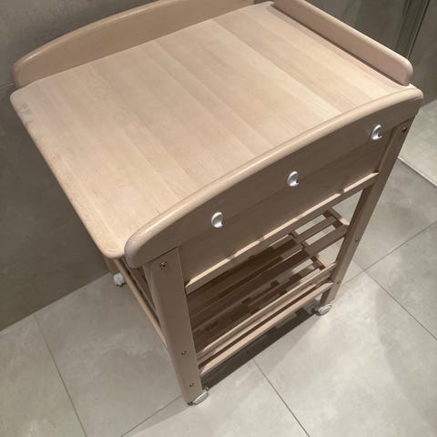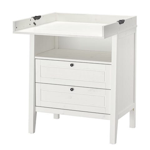 IKEA stellebord med skuffer og åpne hyller i hvit farge. Stellebordet har tre skuffer på den ene siden og to åpne hyller på den andre siden, som gir plass til bleier, klær og annet babyutstyr. Overdelen har kant rundt stelleflaten for å holde stellepute og utstyr på plass.