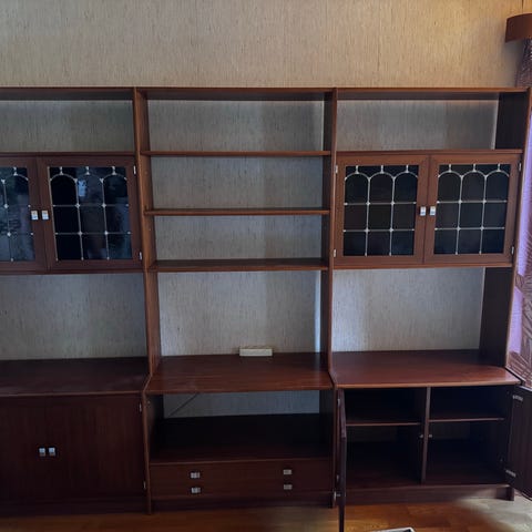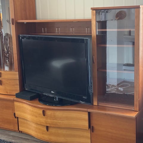 Stor, fin og like hel. Flott skjenk i eik gis bort til første mann. Mål: l 283, h 212, b 61.