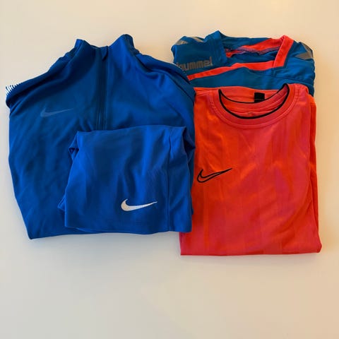 Diverse trenings t skjorter for barn/unisex i størrelse 152. Sett består av t-skjorte og shorts i ulike farger (flerfarget). Plaggene er laget i lett og funksjonelt materiale som egner seg til trening og fysisk aktivitet. Passer til både gutter og jenter i ca. størrelse 152. Selges alt samlet til en god pris. Puma, HH og Norheim er andre merker se bilder for info. Pent til godt brukt masse bruk igjen !